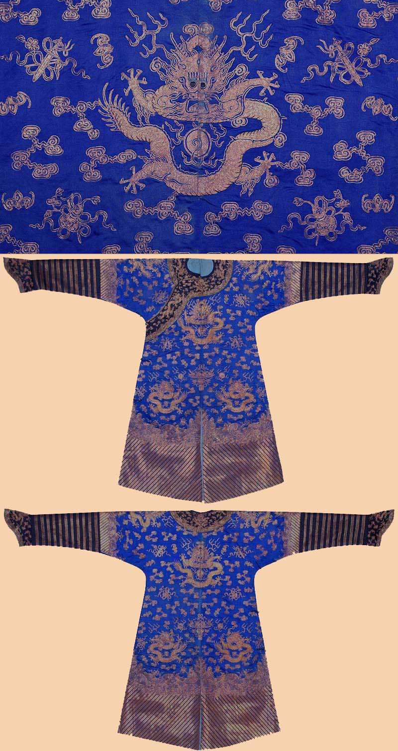 Antique Chinese Robe costumes Court Robe, Dark Blue ground, silk and gilt Goldr metal thread Embroidery with nine dragons chasing flaming pearls front and back, similar dragons on shoulders, amidst clouds and flying cranes, above waves and mountains, striped lower section.. Ching Dynasty. 1644 – 1911