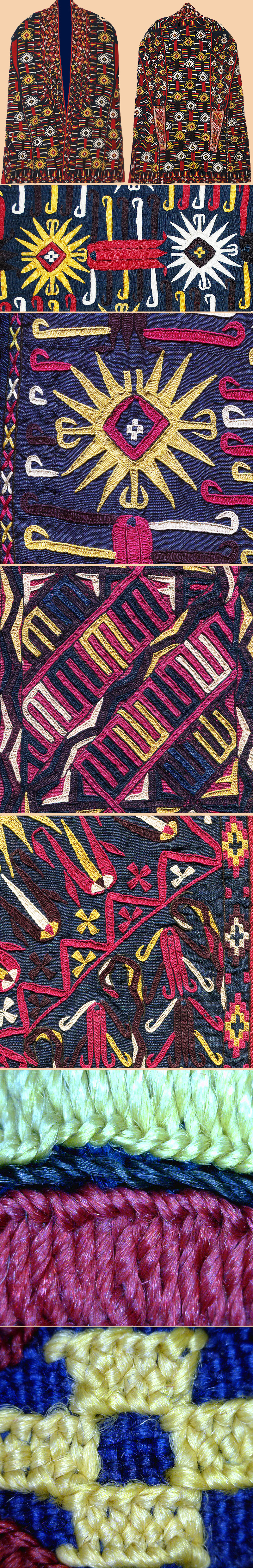 A woman's head cover in the form of a coat, wore by a young married woman of the Turkmen Tekke people. Silk embroidery on dark silk or mixed silk fabric. Its narrow, vestigial sleeves are joined together across the back of the garment with a band. A brown weave and different floral patterned Russian cotton for lining