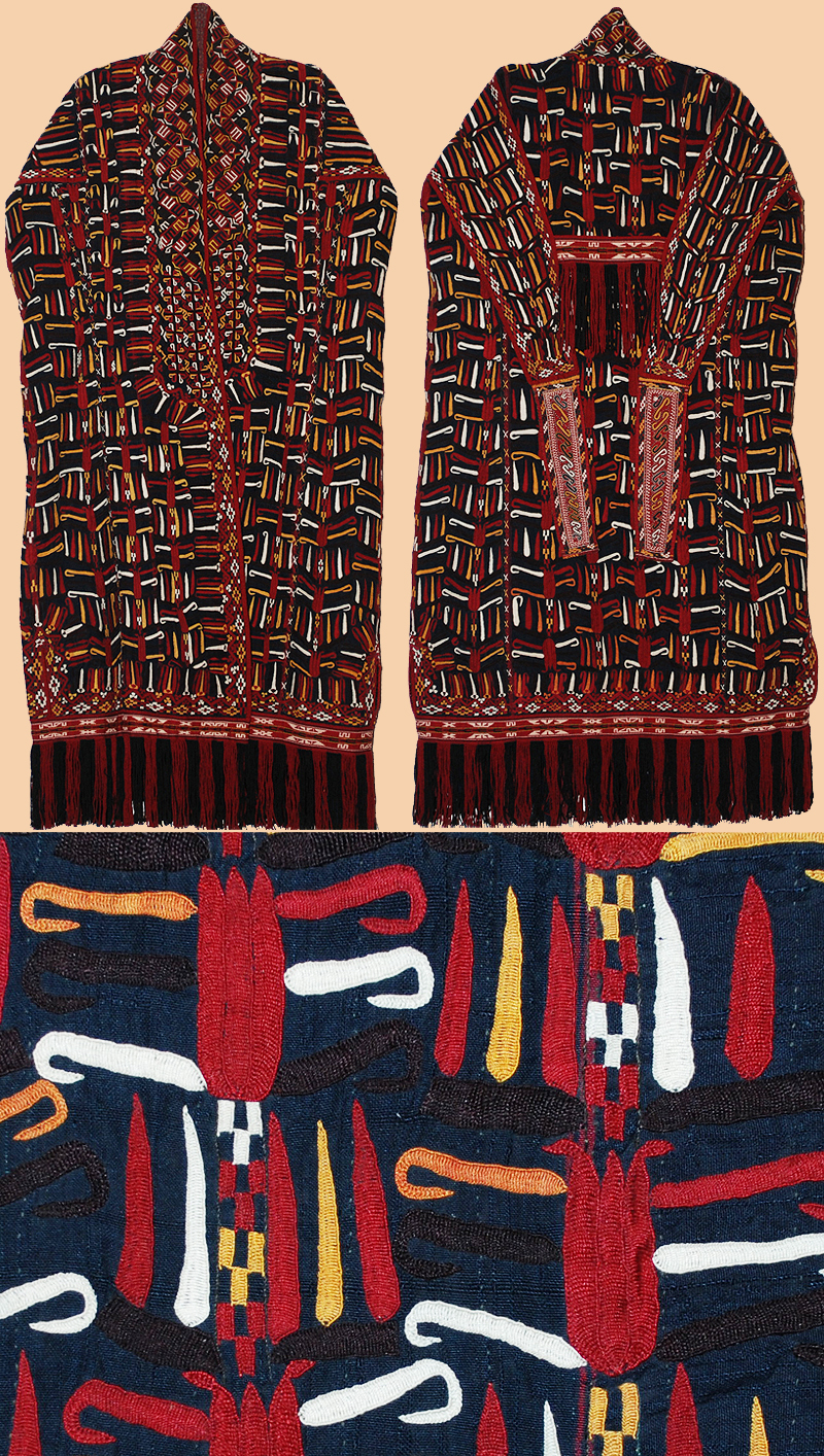 A woman's head cover in the form of a coat, wore by a young married woman of the Turkmen Tekke people. Silk embroidery on dark silk or mixed silk fabric. Its narrow, vestigial sleeves are joined together across the back of the garment with a band. A brown weave and different floral patterned Russian cotton for lining