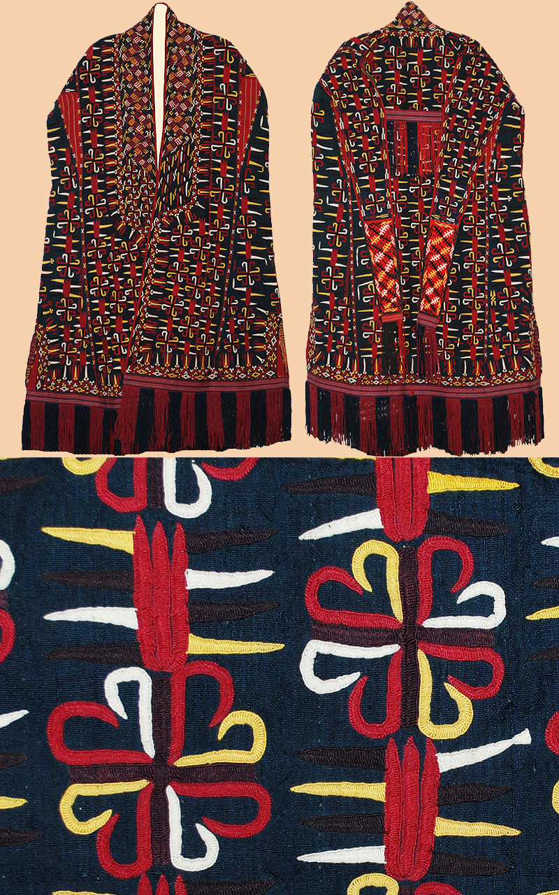 A woman's head cover in the form of a coat, wore by a young married woman of the Turkmen Tekke people. Silk embroidery on dark silk or mixed silk fabric. Its narrow, vestigial sleeves are joined together across the back of the garment with a band. A brown weave and different floral patterned Russian cotton for lining