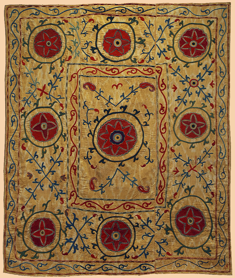 Antique Central Asian Suzani. Silk Embroidery on Silk Ikat.