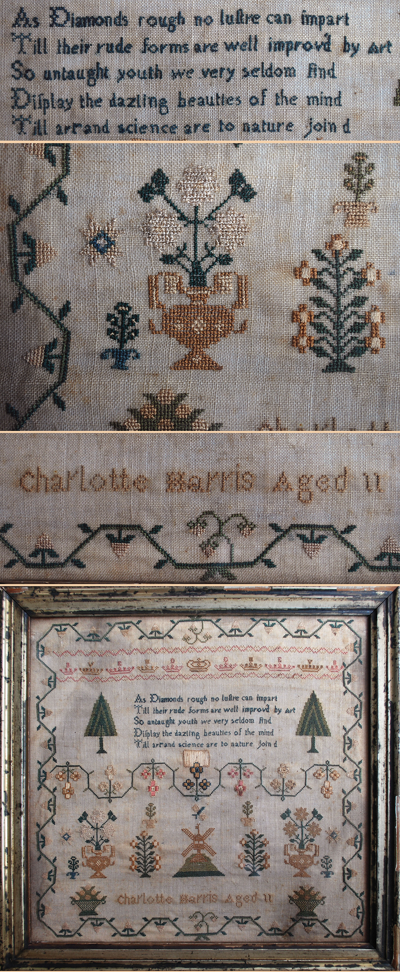 Antique American Sampler Embroidery by Charlotte Harris 11 years old