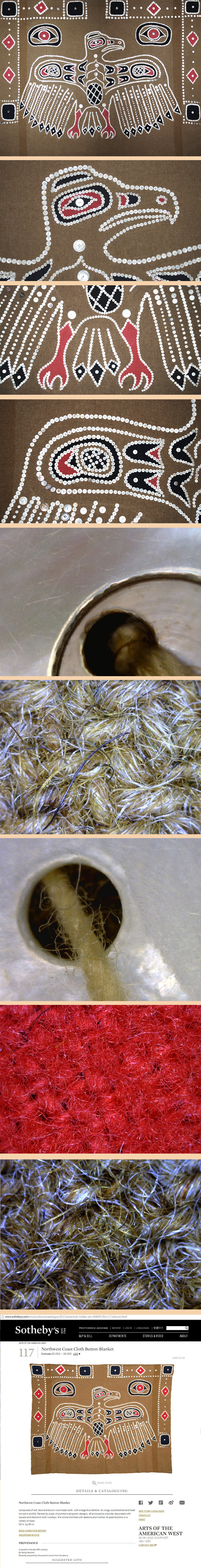 The blankets were originally acquired from the Hudson's Bay Company traders during the mid-19th century. The trade blankets were typically dark blue made from abaloneshells.The central crest typically portrayed a symbol of the wearer's family heritage.