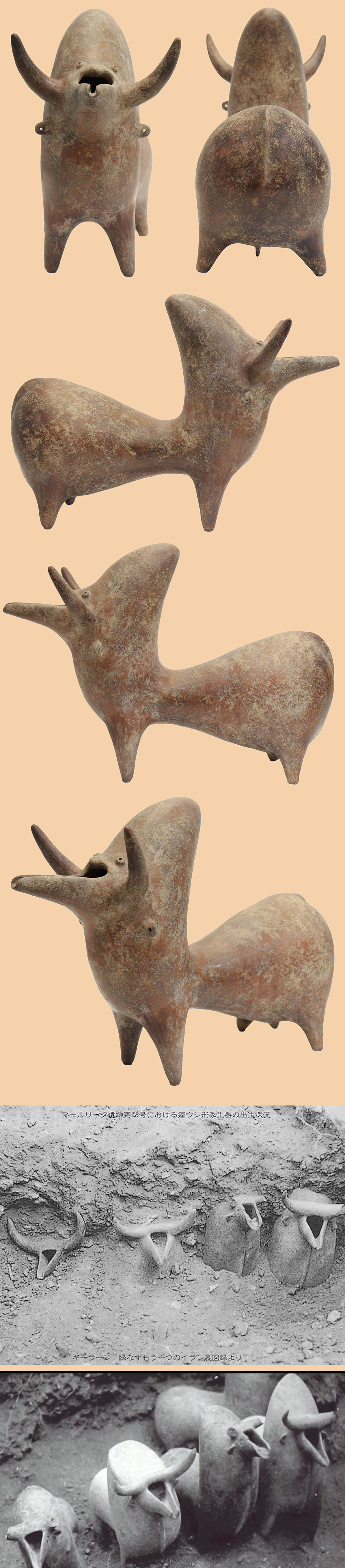 Amlash culture, early 1st millennium BC.From the Marlik region, north-west Iran.This vessel belongs to the Amlash culture of Gilan province in north-west Iran, one of the most distinctive Iranian cultures of the late second and early first millennia BC. This type of vessel, in the form of a hump-backed bull may have had a ceremonial function, although they were certainly also placed in graves. Examples were excavated at Marlik Tepe, one of the richest cemeteries of the region where fifty-three intact tombs were excavated in 1961-62. Thirty-three burnished zoomorphic vessels (that is, in animal form) were excavated, and these were in the form of not only of hump-backed bulls but also stags, rams, horses or donkeys and even a leopard. They are more naturalistically modelled than anthropomorphic figures also found at the site. As many as five identical hump-backed bulls were placed together at one end of one tomb; the similarity of these and of other groups of vessels suggests that they may have been the work of single potters. These containers were clearly intended as pourers, but their exact function remains uncertain. X-ray analysis in The British Museum's Department of Scientific Research has revealed how this vessel was manufactured. It was handmade: the body was made by coiling clay around a flat slab of clay that now forms the underside of the belly; and the back was probably formed by placing another slab of clay over the top, producing a shoe-like form. Further coils were then added to form the neck. Finally the horns, tail, dewlap and feet were modeled from added pieces of clay before carefully burnishing the surfaces, presumably with a pebble..