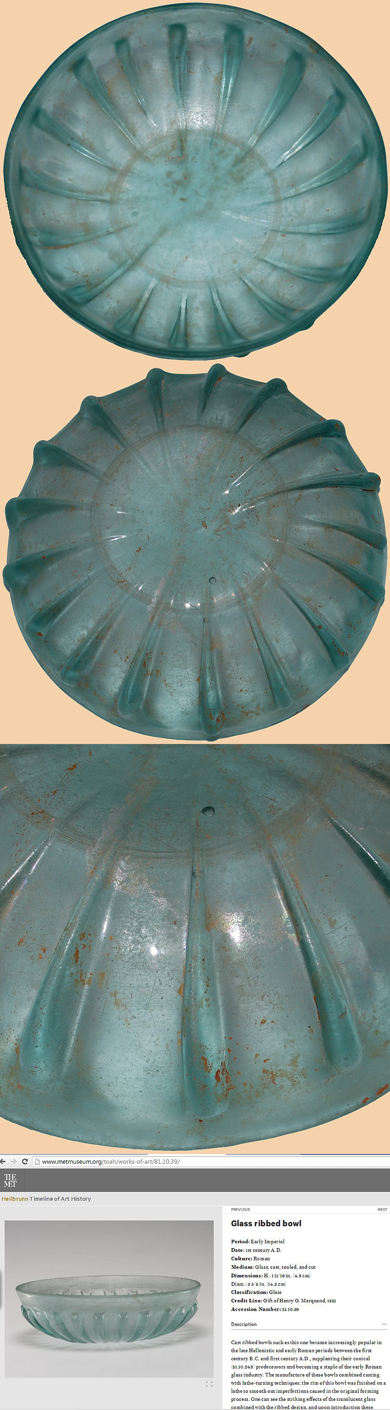 Rotary grinding marks on interior and on plain horizontal band between rim and ribs on exterior.