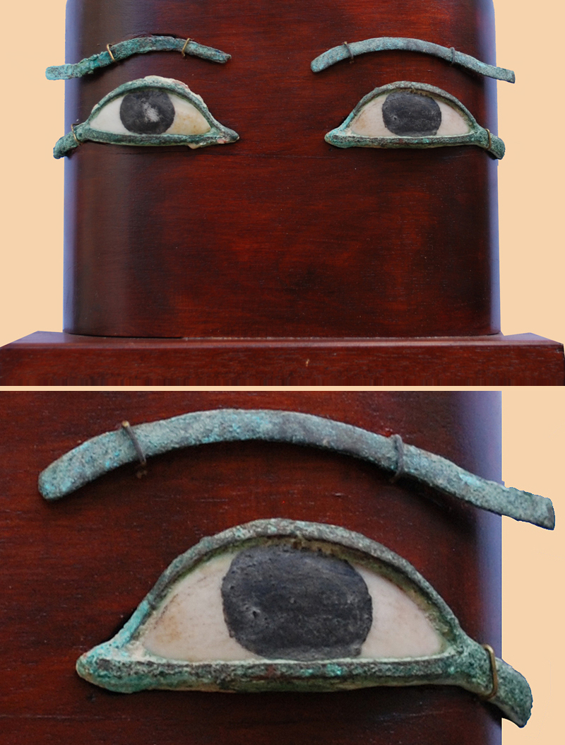 The lide with extending Cosmetic Line, the interiors inlaid with white stone sclerae, The irises in black glazed composition, together with conforming brows,