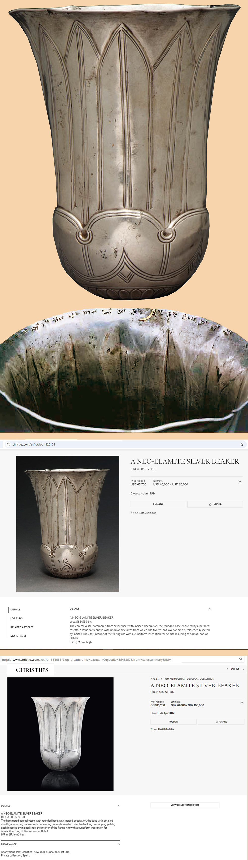 The hammered conical vessel with rounded base, with incised decoration, the base with petalled rosette, a lotus calyx above with undulating curves from which rise twelve long overlapping petals, each bisected by incised lines, the interior of the flaring rim with a cuneiform inscription for Annishilha, King of Samati, son of Dabala