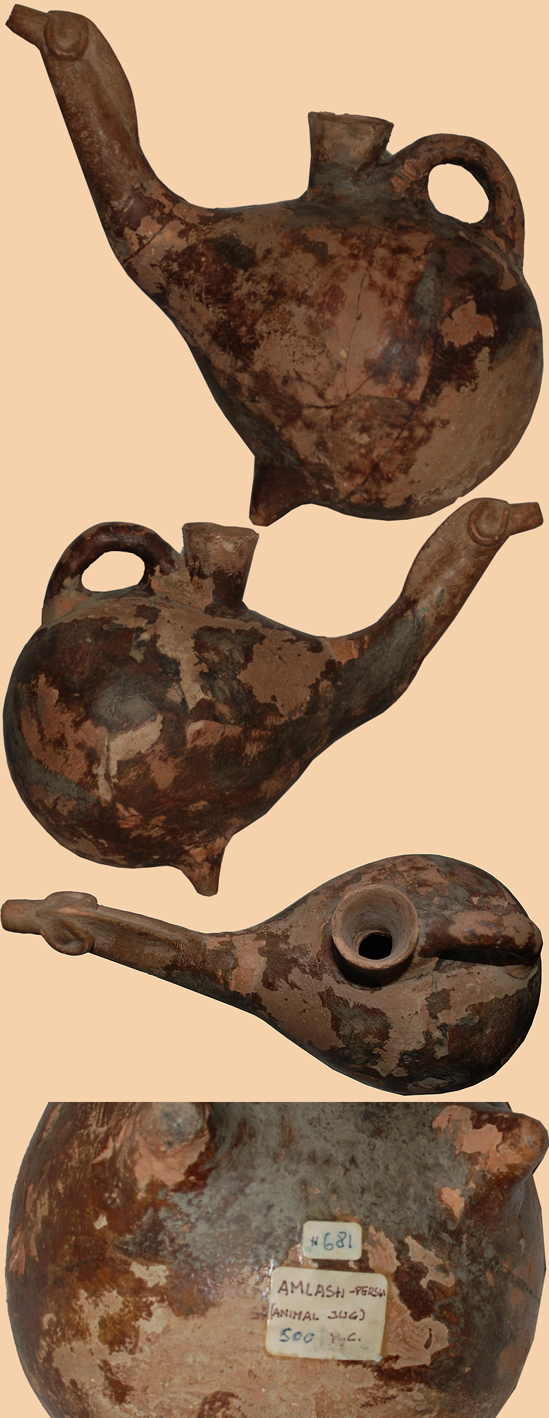Amlash culture, early 1st millennium BC.From the Marlik region, north-west Iran.This vessel belongs to the Amlash culture of Gilan province in north-west Iran, one of the most distinctive Iranian cultures of the late second and early first millennia BC. This type of vessel, in the form of a hump-backed bull may have had a ceremonial function, although they were certainly also placed in graves. Examples were excavated at Marlik Tepe, one of the richest cemeteries of the region where fifty-three intact tombs were excavated in 1961-62. Thirty-three burnished zoomorphic vessels (that is, in animal form) were excavated, and these were in the form of not only of hump-backed bulls but also stags, rams, horses or donkeys and even a leopard. They are more naturalistically modelled than anthropomorphic figures also found at the site. As many as five identical hump-backed bulls were placed together at one end of one tomb; the similarity of these and of other groups of vessels suggests that they may have been the work of single potters. These containers were clearly intended as pourers, but their exact function remains uncertain. X-ray analysis in The British Museum's Department of Scientific Research has revealed how this vessel was manufactured. It was handmade: the body was made by coiling clay around a flat slab of clay that now forms the underside of the belly; and the back was probably formed by placing another slab of clay over the top, producing a shoe-like form. Further coils were then added to form the neck. Finally the horns, tail, dewlap and feet were modeled from added pieces of clay before carefully burnishing the surfaces, presumably with a pebble..