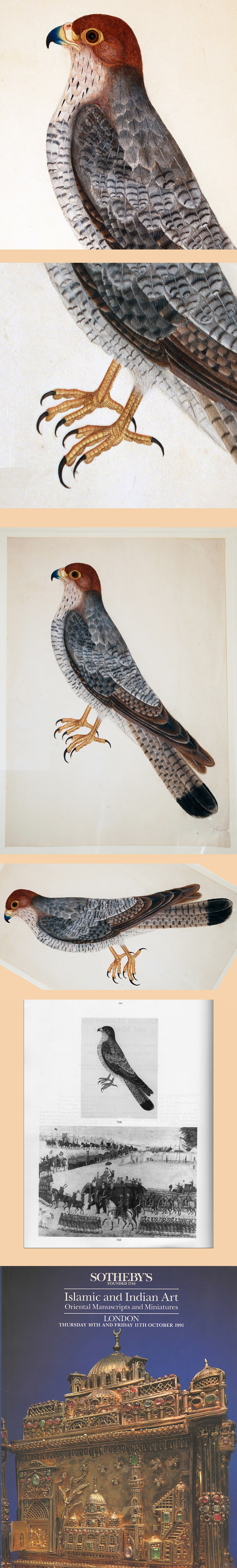 Antique Indian Water Color Painting, A Hawk with Russet Head and Blue Bill, the Body Feathers barred in Grey and Brown, Company School Bengal. late 18th Century