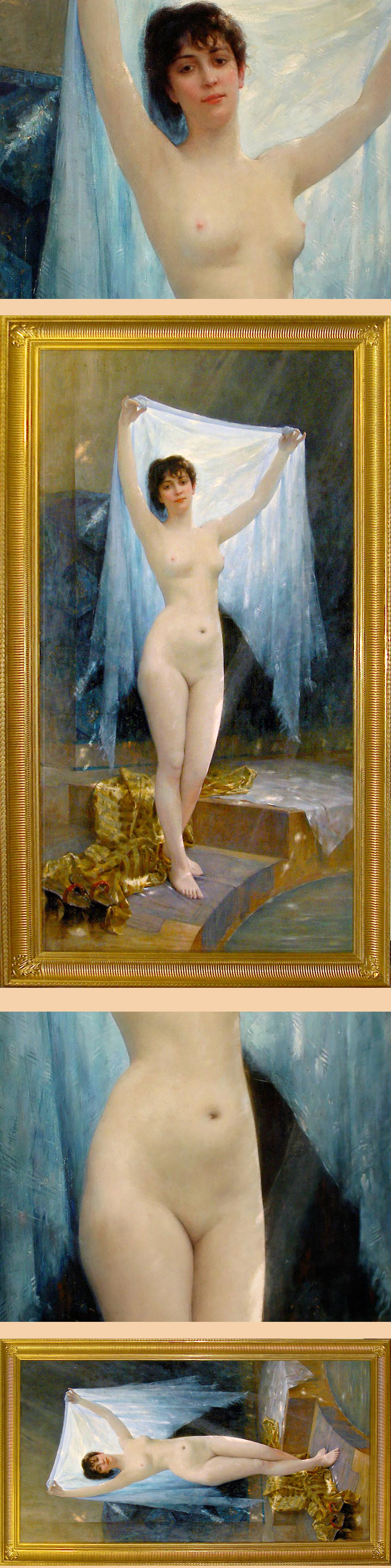 Antique French Nude with Veil Oil Painting on Canvas, created in 1883 by artist Albert Aublet 1851-1938