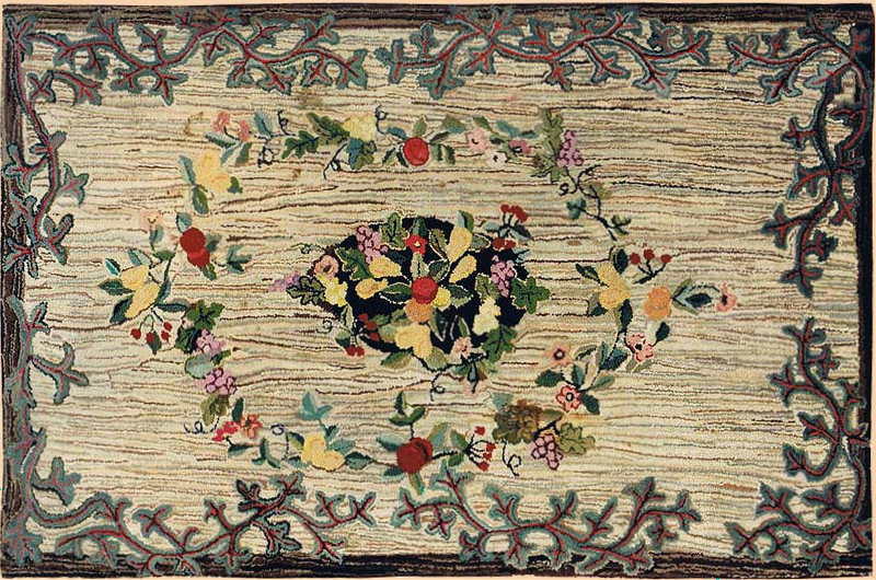 Most old hooked rugs have been repaired in the course of time, and the presence of patches on the back of a rug does not lessen its desirability, that is, if the restoration has been well done with colors and cloth in the same type as the original. Rugs are frequently rebound to cover wear at the edges, and again, rebinding does not reduce a rug's desirability if the restoration has been done well. The only proper way to repair a hole in a hooked rug is to sew a small burlap patch to the base and rehook the missing area. A rug that has been repaired with sewing thread will not hold up if used underfoot. Virtually all old hooked rugs were worked on burlap or homespun linen, whereas hooked rugs on white monk's cloth could be presumed to be modern. Hooked rugs that are used on a hard wood floor should have a thin rubber base to insure longer wear.