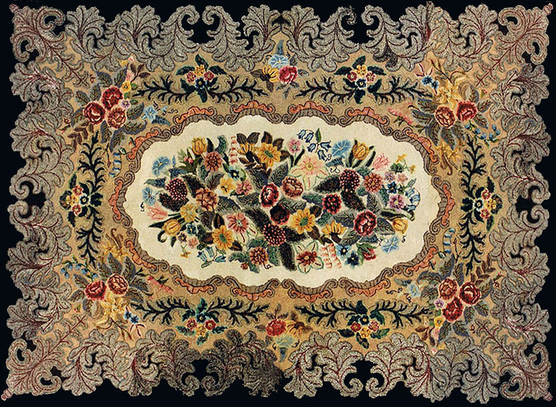 Most old hooked rugs have been repaired in the course of time, and the presence of patches on the back of a rug does not lessen its desirability, that is, if the restoration has been well done with colors and cloth in the same type as the original. Rugs are frequently rebound to cover wear at the edges, and again, rebinding does not reduce a rug's desirability if the restoration has been done well. The only proper way to repair a hole in a hooked rug is to sew a small burlap patch to the base and rehook the missing area. A rug that has been repaired with sewing thread will not hold up if used underfoot. Virtually all old hooked rugs were worked on burlap or homespun linen, whereas hooked rugs on white monk's cloth could be presumed to be modern. Hooked rugs that are used on a hard wood floor should have a thin rubber base to insure longer wear.