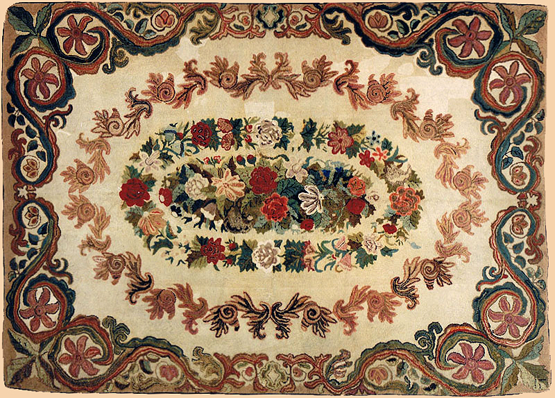 Most old hooked rugs have been repaired in the course of time, and the presence of patches on the back of a rug does not lessen its desirability, that is, if the restoration has been well done with colors and cloth in the same type as the original. Rugs are frequently rebound to cover wear at the edges, and again, rebinding does not reduce a rug's desirability if the restoration has been done well. The only proper way to repair a hole in a hooked rug is to sew a small burlap patch to the base and rehook the missing area. A rug that has been repaired with sewing thread will not hold up if used underfoot. Virtually all old hooked rugs were worked on burlap or homespun linen, whereas hooked rugs on white monk's cloth could be presumed to be modern. Hooked rugs that are used on a hard wood floor should have a thin rubber base to insure longer wear.