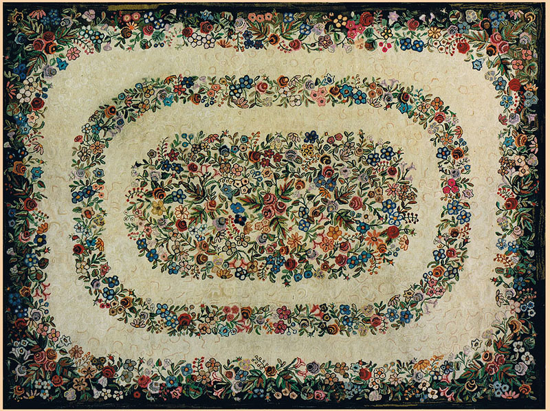 Most old hooked rugs have been repaired in the course of time, and the presence of patches on the back of a rug does not lessen its desirability, that is, if the restoration has been well done with colors and cloth in the same type as the original. Rugs are frequently rebound to cover wear at the edges, and again, rebinding does not reduce a rug's desirability if the restoration has been done well. The only proper way to repair a hole in a hooked rug is to sew a small burlap patch to the base and rehook the missing area. A rug that has been repaired with sewing thread will not hold up if used underfoot. Virtually all old hooked rugs were worked on burlap or homespun linen, whereas hooked rugs on white monk's cloth could be presumed to be modern. Hooked rugs that are used on a hard wood floor should have a thin rubber base to insure longer wear.