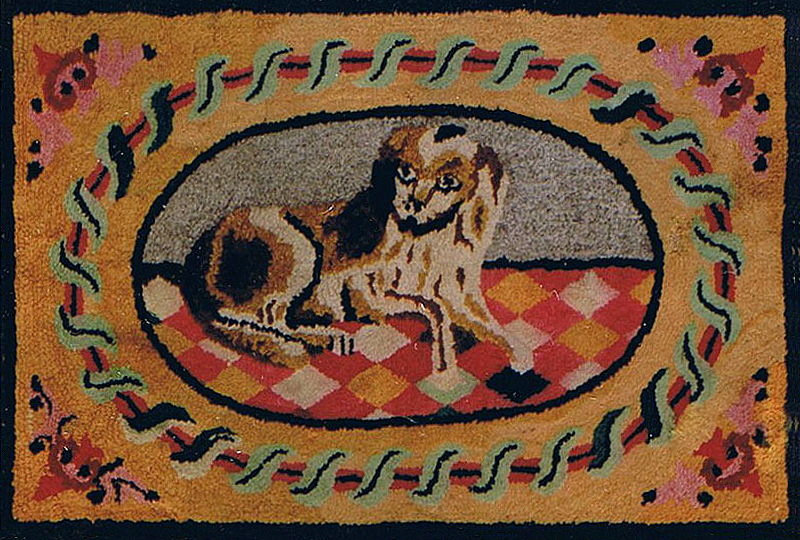 Most old hooked rugs have been repaired in the course of time, and the presence of patches on the back of a rug does not lessen its desirability, that is, if the restoration has been well done with colors and cloth in the same type as the original. Rugs are frequently rebound to cover wear at the edges, and again, rebinding does not reduce a rug's desirability if the restoration has been done well. The only proper way to repair a hole in a hooked rug is to sew a small burlap patch to the base and rehook the missing area. A rug that has been repaired with sewing thread will not hold up if used underfoot. Virtually all old hooked rugs were worked on burlap or homespun linen, whereas hooked rugs on white monk's cloth could be presumed to be modern. Hooked rugs that are used on a hard wood floor should have a thin rubber base to insure longer wear.