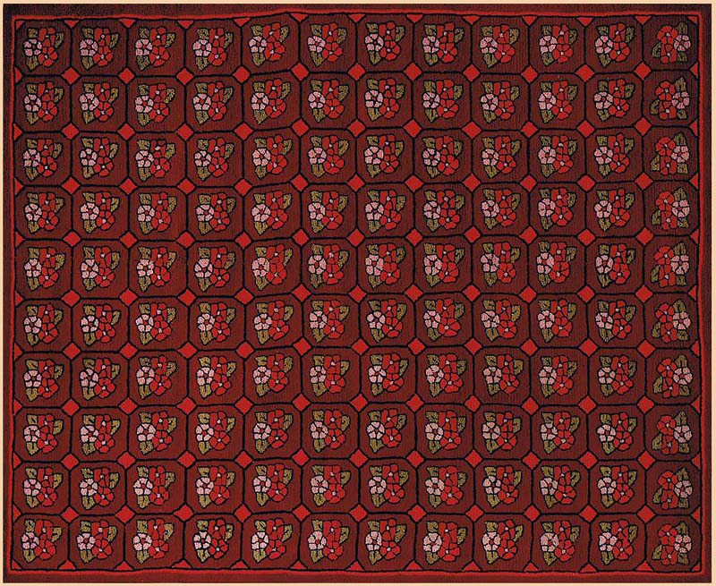 Most old hooked rugs have been repaired in the course of time, and the presence of patches on the back of a rug does not lessen its desirability, that is, if the restoration has been well done with colors and cloth in the same type as the original. Rugs are frequently rebound to cover wear at the edges, and again, rebinding does not reduce a rug's desirability if the restoration has been done well. The only proper way to repair a hole in a hooked rug is to sew a small burlap patch to the base and rehook the missing area. A rug that has been repaired with sewing thread will not hold up if used underfoot. Virtually all old hooked rugs were worked on burlap or homespun linen, whereas hooked rugs on white monk's cloth could be presumed to be modern. Hooked rugs that are used on a hard wood floor should have a thin rubber base to insure longer wear.