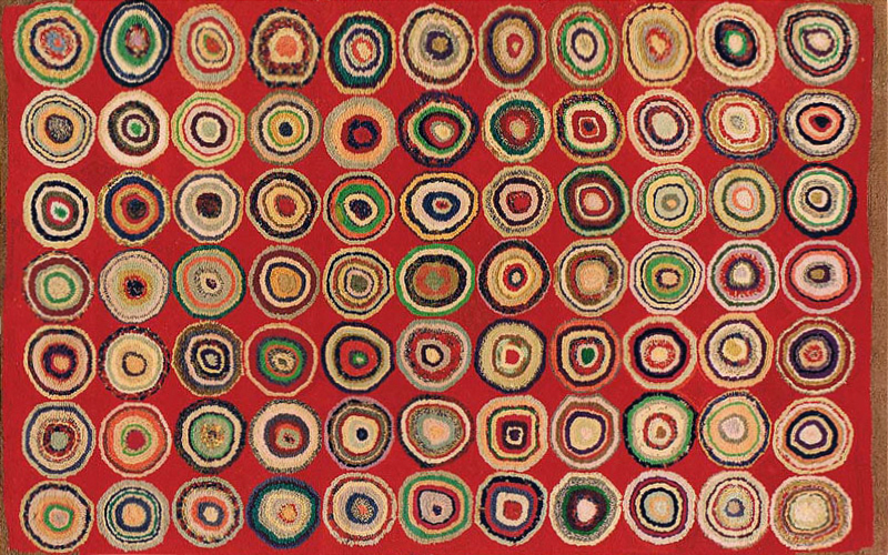 Most old hooked rugs have been repaired in the course of time, and the presence of patches on the back of a rug does not lessen its desirability, that is, if the restoration has been well done with colors and cloth in the same type as the original. Rugs are frequently rebound to cover wear at the edges, and again, rebinding does not reduce a rug's desirability if the restoration has been done well. The only proper way to repair a hole in a hooked rug is to sew a small burlap patch to the base and rehook the missing area. A rug that has been repaired with sewing thread will not hold up if used underfoot. Virtually all old hooked rugs were worked on burlap or homespun linen, whereas hooked rugs on white monk's cloth could be presumed to be modern. Hooked rugs that are used on a hard wood floor should have a thin rubber base to insure longer wear.