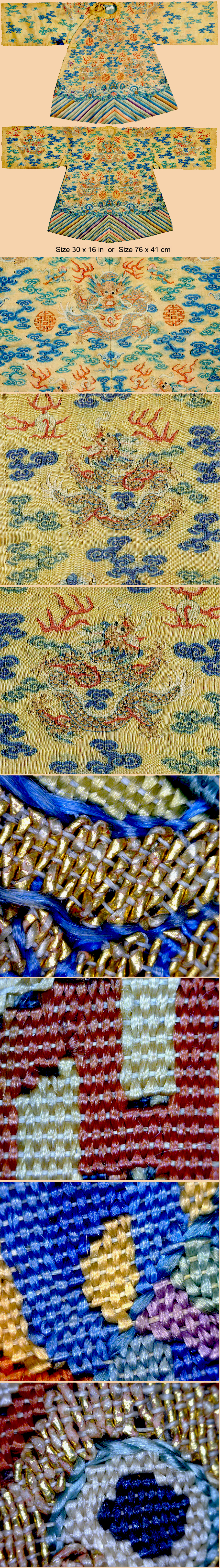 An Very Important Chinese Qing Dynasty Antique Imperial Silk & Gold Yellow Kesi jifu Child Robe with Dragons amid Cloud with Shou Medallions,