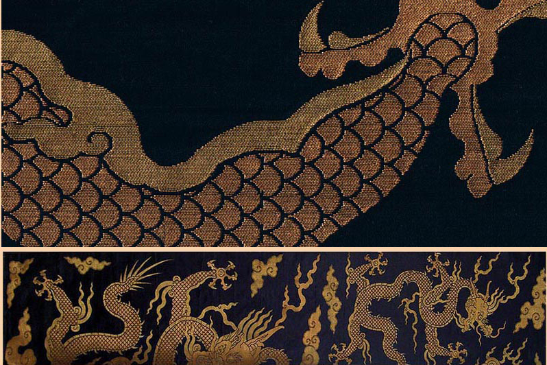 Antique Chinese Textile, Ming Dynasty. Silk Brocade with gold thread on dark navy blue silk Circa 1600 A.D
