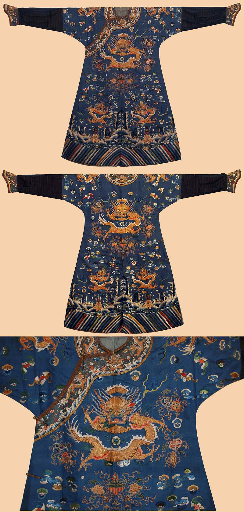 Antique Chinese Robe. Court Robe, China. Silk twill ground, silk and gilt Gold metal thread Embroidery Pattern of three dragons chasing flaming pearls front and back, similar dragons on shoulders, amidst clouds and flying cranes, above waves and mountains, striped lower section.
