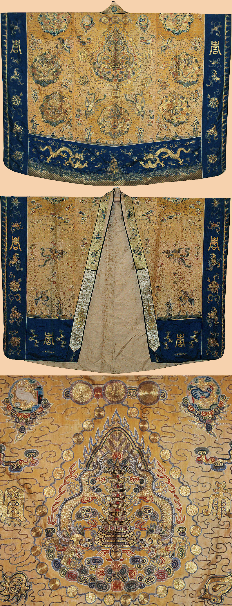 Antique Chinese Priest's Robe, China. Silk twill ground, silk and gilt Gold metal thread Embroidery, Pattern of dragons chasing flaming pearls front and back, similar dragons on shoulders, amidst clouds and flying cranes, above waves and mountains, striped lower section.
