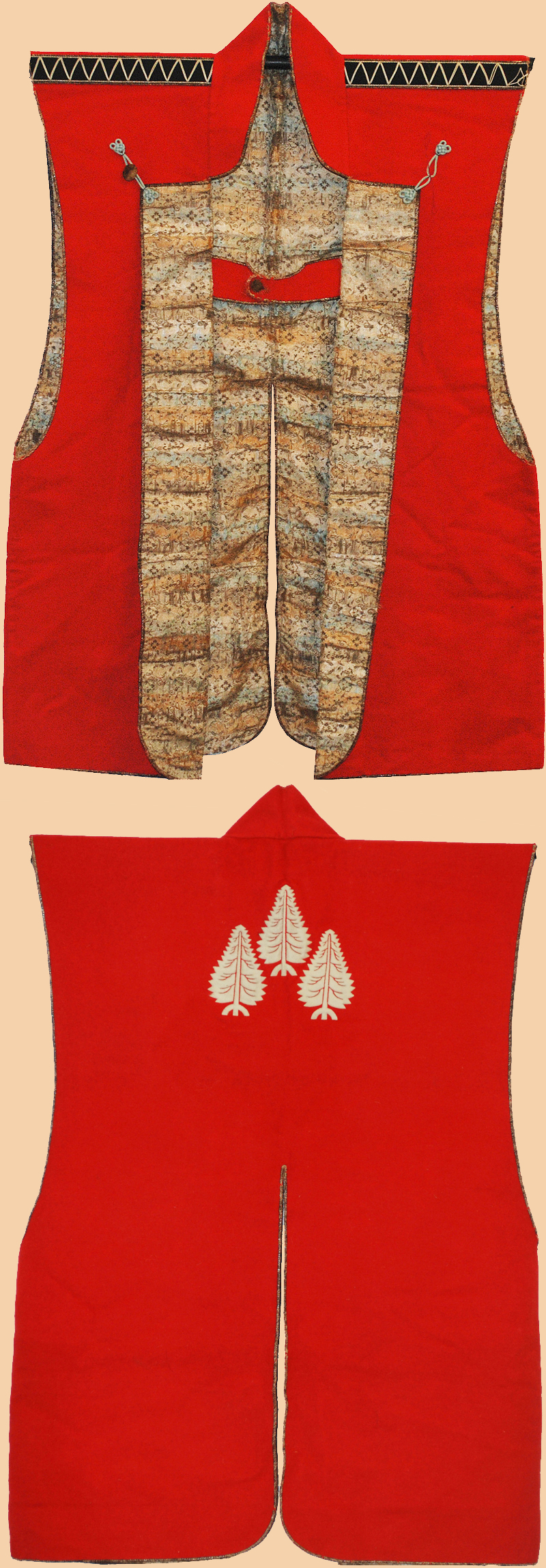 Samurai Robe. This is a Jin-Baori, battle surcoat worn over armor which is made of red wool and silk brocade. Its design was partly copied from western clothing of Portuguese who first came to Japan in 16th century. It has beautiful "warabi-mon" bracken crest in the back which is applique.