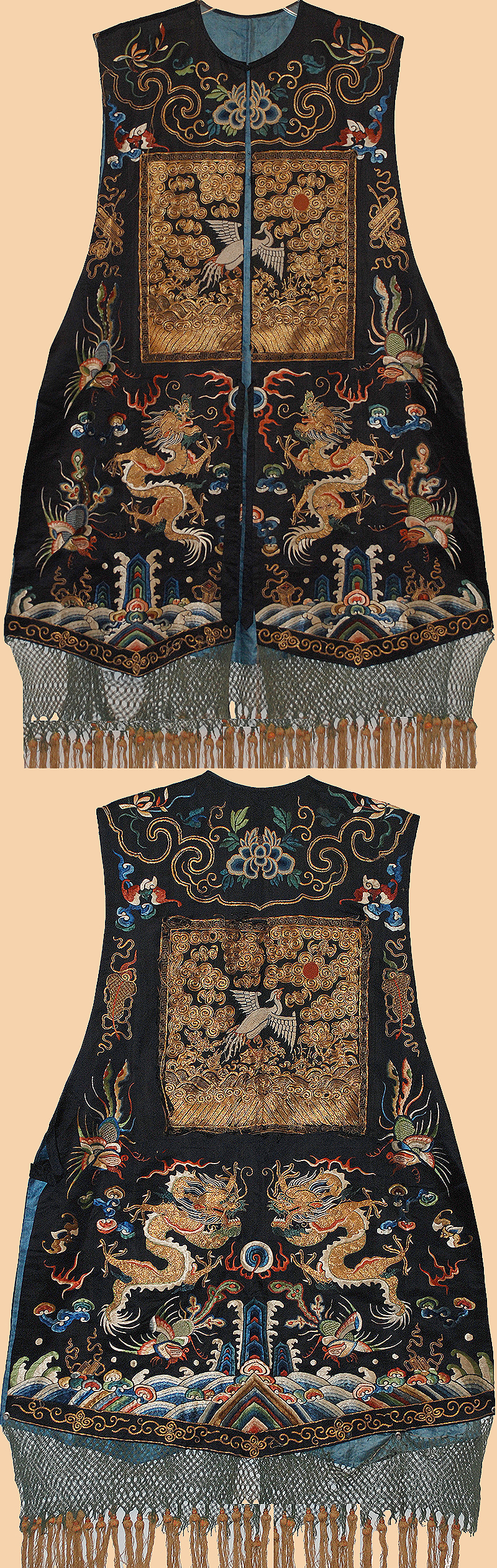 Antique Chinese Vest. Court Vest, China. Silk twill ground, silk and gilt Gold metal thread Embroidery, Pattern of dragons chasing flaming pearls front and back, similar dragons on shoulders, amidst clouds and flying cranes, above waves and mountains, striped lower section.