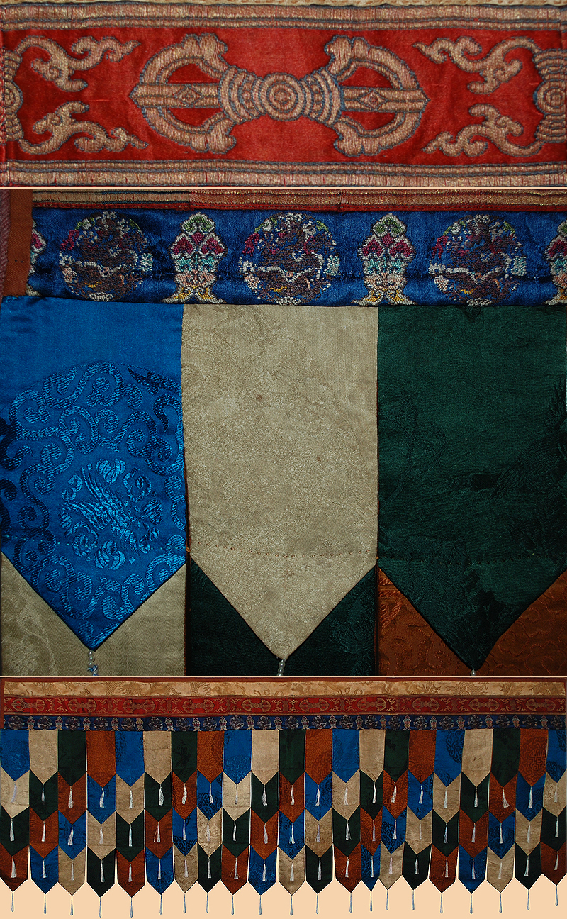 Antique Temple Banner With four tiers of ribbons in damask and Bennars silk the top frieze woven with uajras Circa 1800