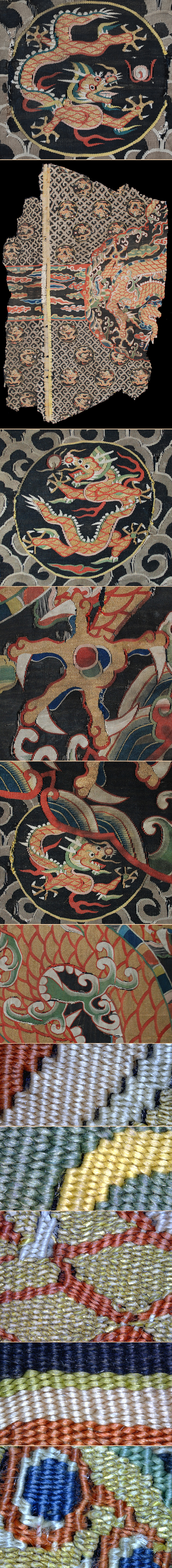 Antique Chinese Imperial Silk & Gold Kesi Panel, Extremely Fine Woven with Circular Dragon Roundels on a Latticework Ground of Stylized Clouds,