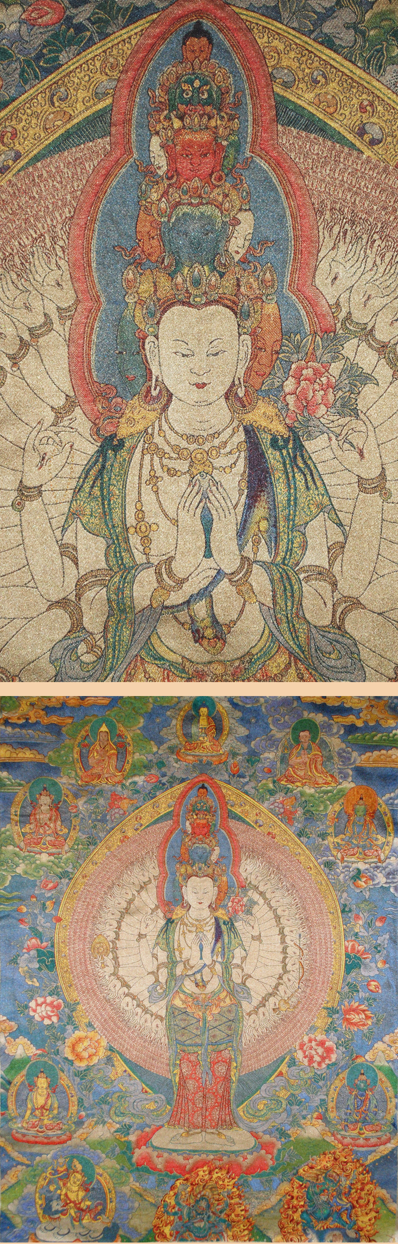Deity thangkas: These thangkas depict a particular Buddhist deity, such as the Buddha, Avalokiteshvara, or Tara. Deity thangkas are often used for meditation and worship.