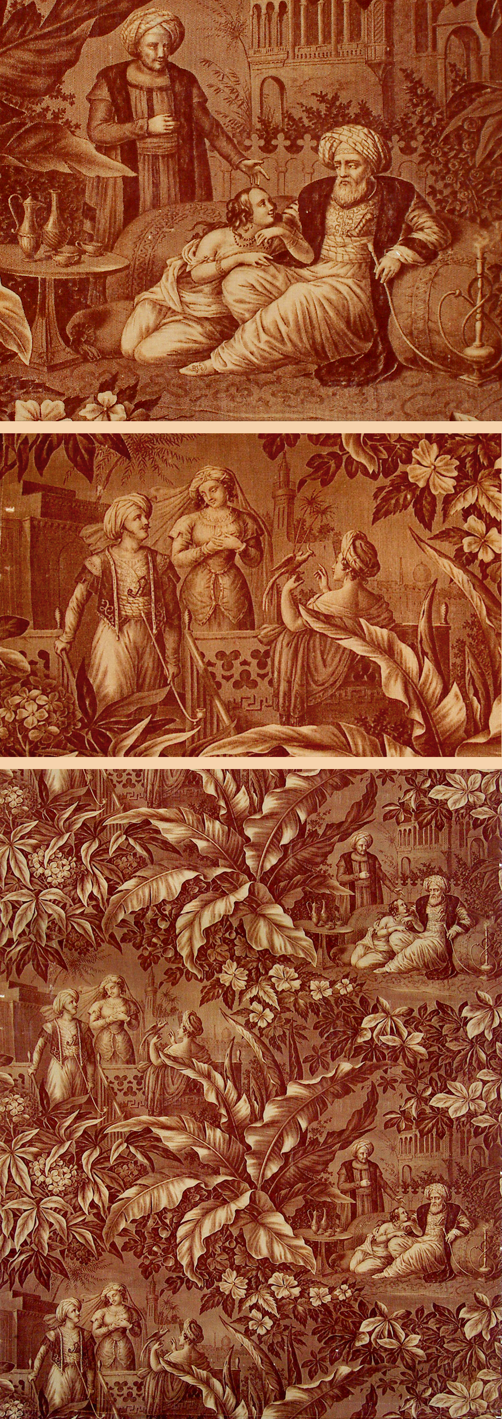 Antique French Textile, Print on Cotton Oriental Scenes by: Koechlin