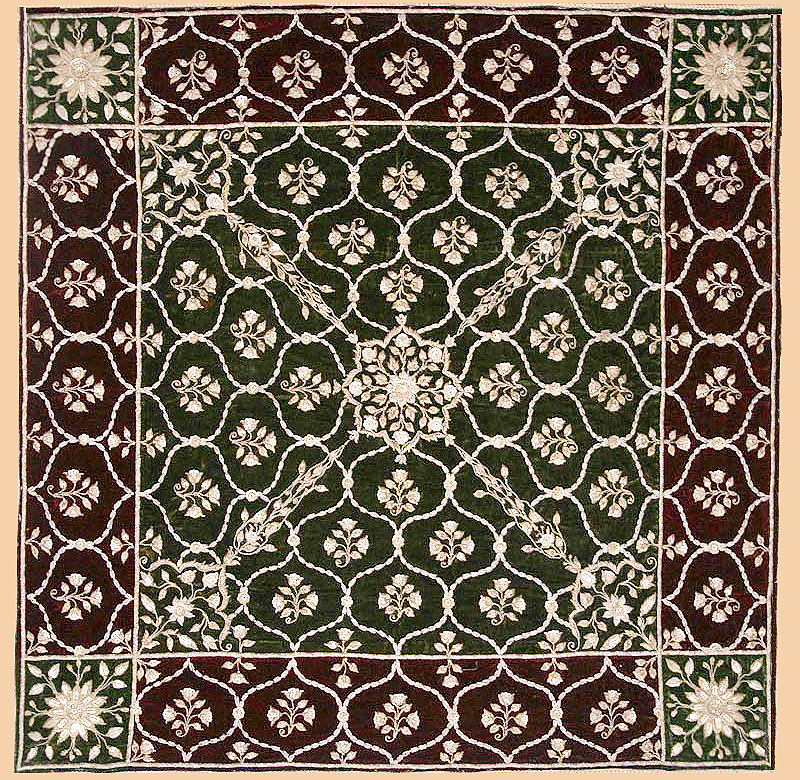 Antique Indian Textile. Velvet Embroidery With Silver Thread, Central Velvet in Dark Green, Border in Dark Red. Mughal Dynasty 1526-1857A.D