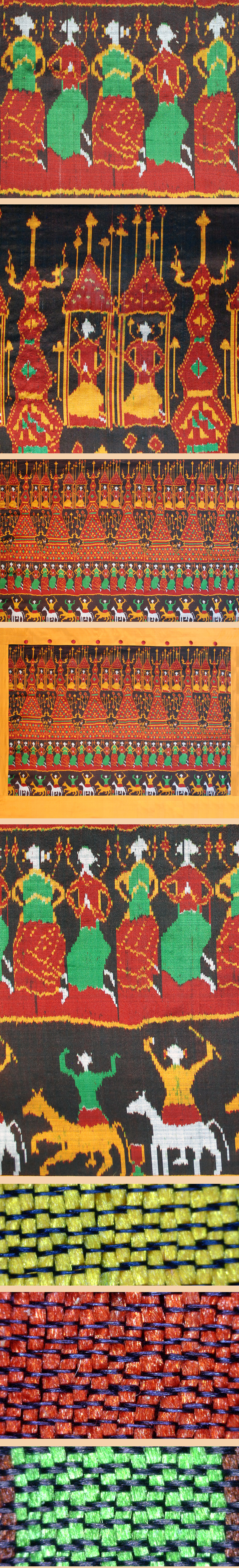Cambodian pidan are intricately and spectacularly patterned using the weft resist tie-dyed method referred to as hol. The word pidan indicates their traditional use as a hanging or canopy and the term has been widely associated with Buddhist textiles. Woven in silk using an uneven twill groundweave, these extremely complex depictions illustrated Theravada Buddhist themes