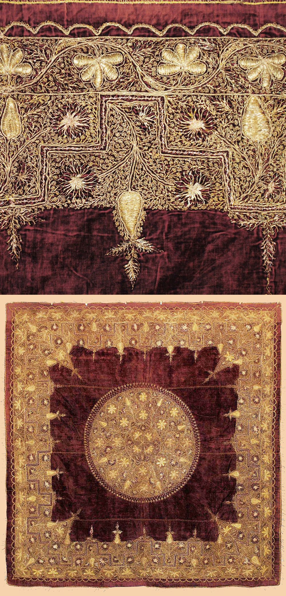 Antique Indian Textile. Table Cover Gold Embroidery on red velvet 1800-1900 A.D