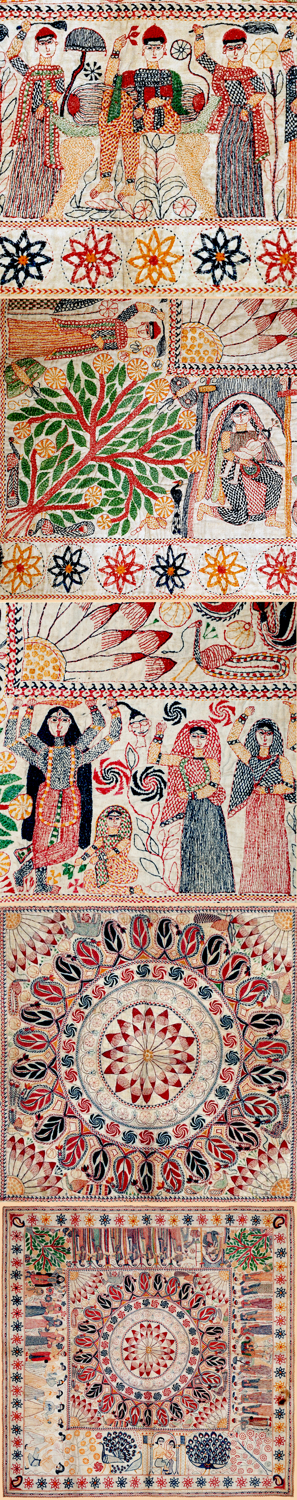 Kantha hails from the regions of erstwhile East Bengal, present day West Bengal and Bihar. Essentially a woman's art, it is a form of patched, quilted and vividly embroidered textile made entirely out of used cloth.