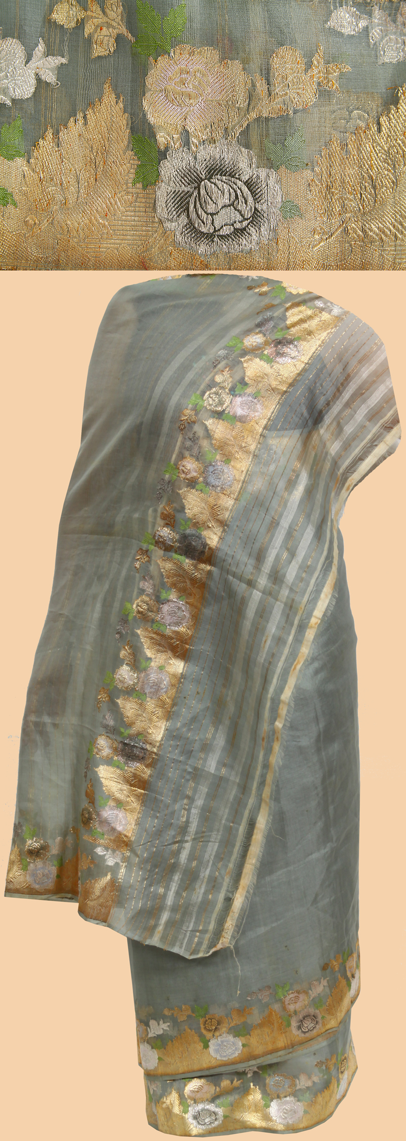 Antique Indian Silk with Gold and Silver Threade Sari. Mughal Dynasty 1526 - 1857 A.D