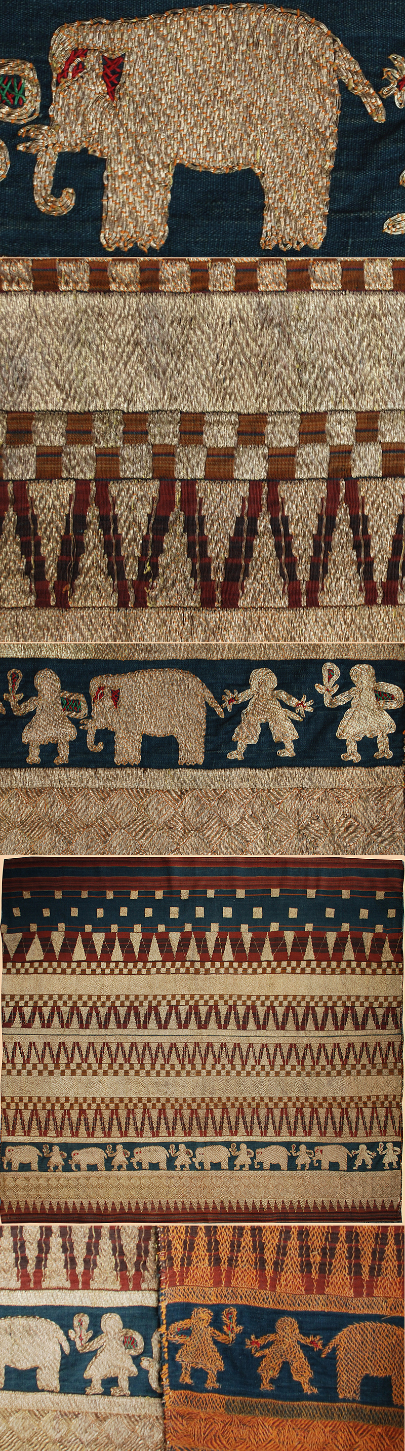 Sumatra, the Isle of Gold located along the maritime route between Asia and the West, was part of the early global network of commerce and cultural exchange. In the southern tip of Sumatra, the people of Lampung poured their trading profits into ceremonial materials and artful adornments. Wealthy women of this region created a distinctive genre of garments that exemplifies their family prestige, clan identity and affluence. These ornate tubular sarongs, or tapis, were woven from cotton in horizontal stripe design and further decorated with metallic threads, silk embroidery, mica fragments and other shiny materials. They were worn with similarly decorated long-sleeved jackets. This example is almost totally covered with couched metallic thread