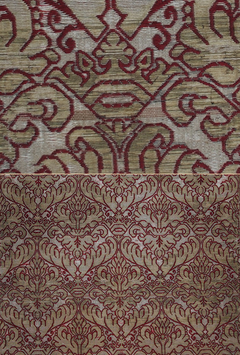 The pattern is a lattice of arabesques containing a symmetrically placed and balanced stylized plant motif.