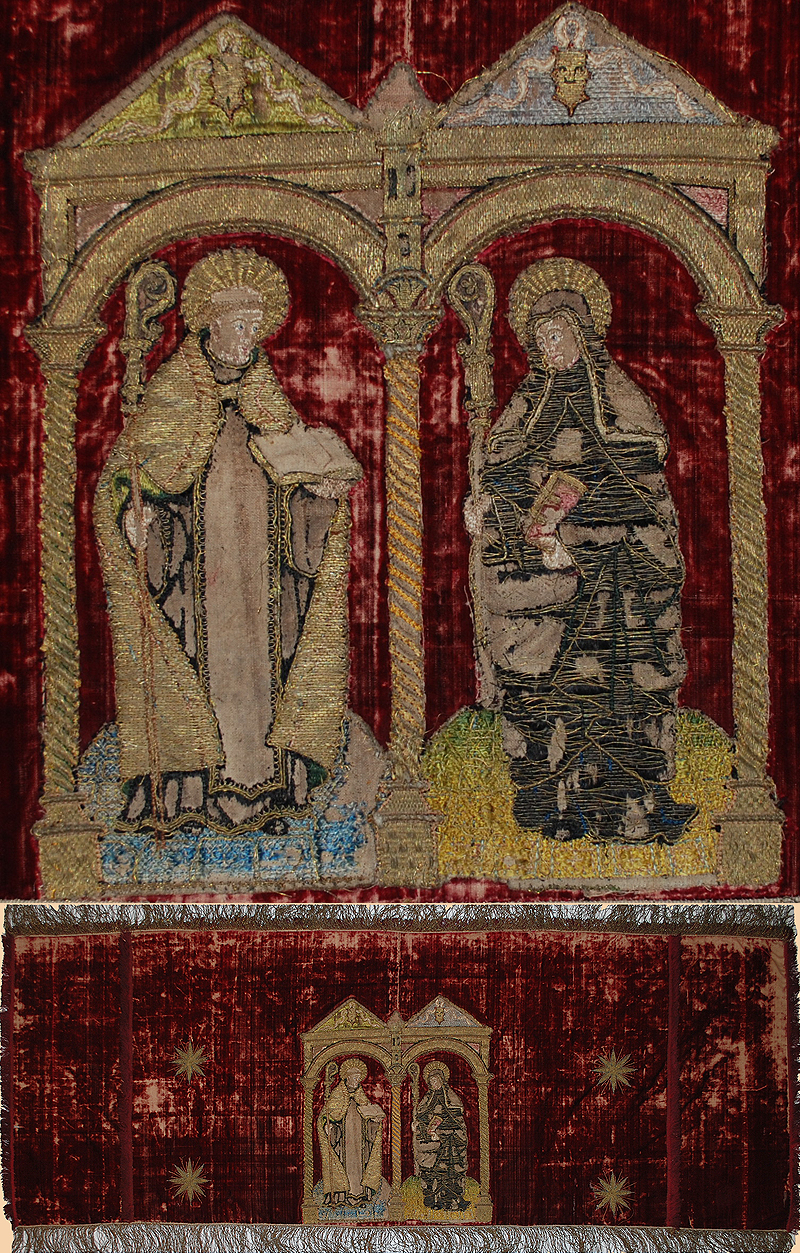 Antique Italian Textile, Velvet Embroidery Valance with two Saints made with SIlver thread.