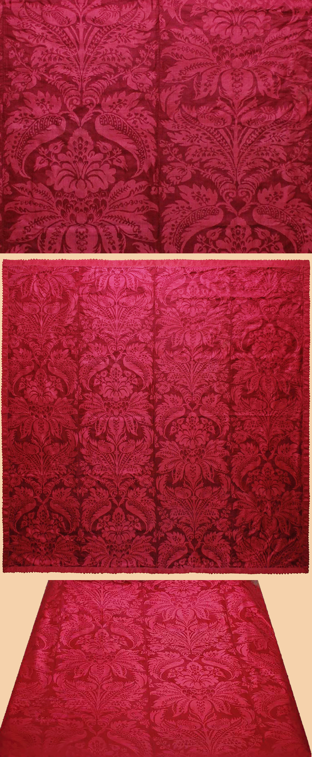 Antique Italian Textile, A Four Panel Joined Coverlet of Crimson Damask