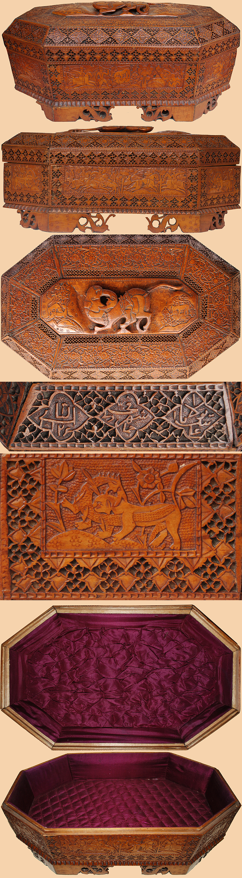Antique Persian Safavi Dynasty Jewelry Box Extremely Fine Carved Wood Box. Date Carved on the Box show 1126 in Islamic Calendar