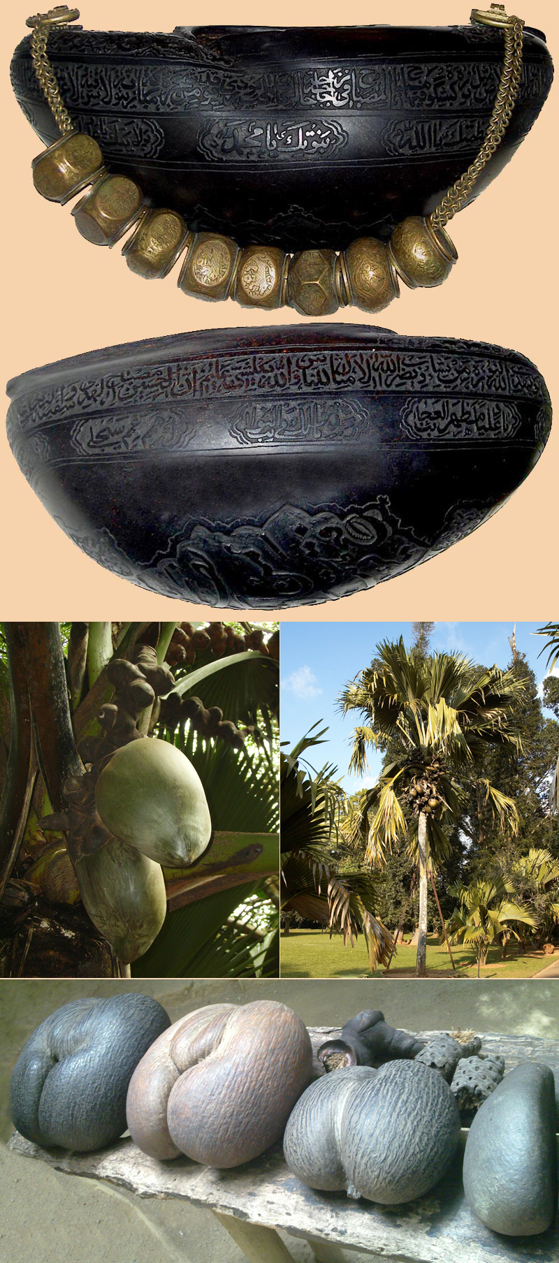 Kashkuls carried the donations on which dervishes relied for sustenance and also functioned as drinking vessels or food containers for wandering ascetics. They simultaneously symbolized the emptying of the Sufi’s soul or ego through the renunciation of worldly goods and aspirations, and the nourishment of that soul with divine knowledge. Many the coco-de-mr palm native to Seychelles Island of the Indian Ocean. The shells’ lengthy sea voyage to the shores of Iran carries special significance as a metaphor for the Sufi’s mystical journey. The top of this example shows a paradisiacal scene of birds in flowering, fruit laden trees.
