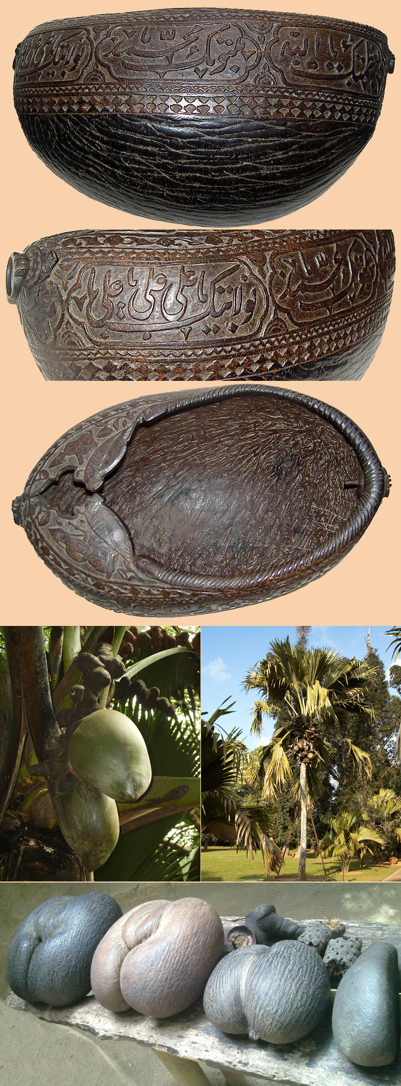 Kashkuls carried the donations on which dervishes relied for sustenance and also functioned as drinking vessels or food containers for wandering ascetics. They simultaneously symbolized the emptying of the Sufi’s soul or ego through the renunciation of worldly goods and aspirations, and the nourishment of that soul with divine knowledge. Many the coco-de-mr palm native to Seychelles Island of the Indian Ocean. The shells’ lengthy sea voyage to the shores of Iran carries special significance as a metaphor for the Sufi’s mystical journey. The top of this example shows a paradisiacal scene of birds in flowering, fruit laden trees.