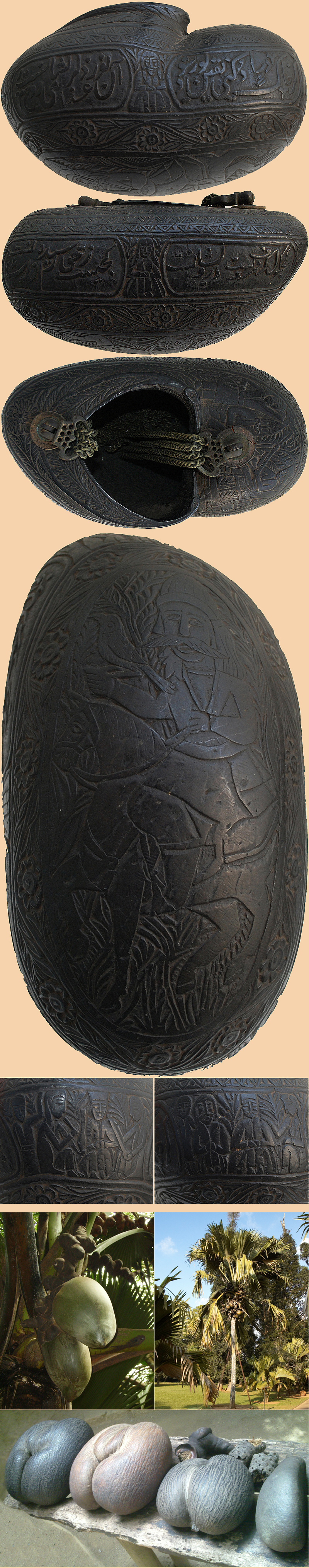 Kashkuls carried the donations on which dervishes relied for sustenance and also functioned as drinking vessels or food containers for wandering ascetics. They simultaneously symbolized the emptying of the Sufi’s soul or ego through the renunciation of worldly goods and aspirations, and the nourishment of that soul with divine knowledge. Many the coco-de-mr palm native to Seychelles Island of the Indian Ocean. The shells’ lengthy sea voyage to the shores of Iran carries special significance as a metaphor for the Sufi’s mystical journey. The top of this example shows a paradisiacal scene of birds in flowering, fruit laden trees.