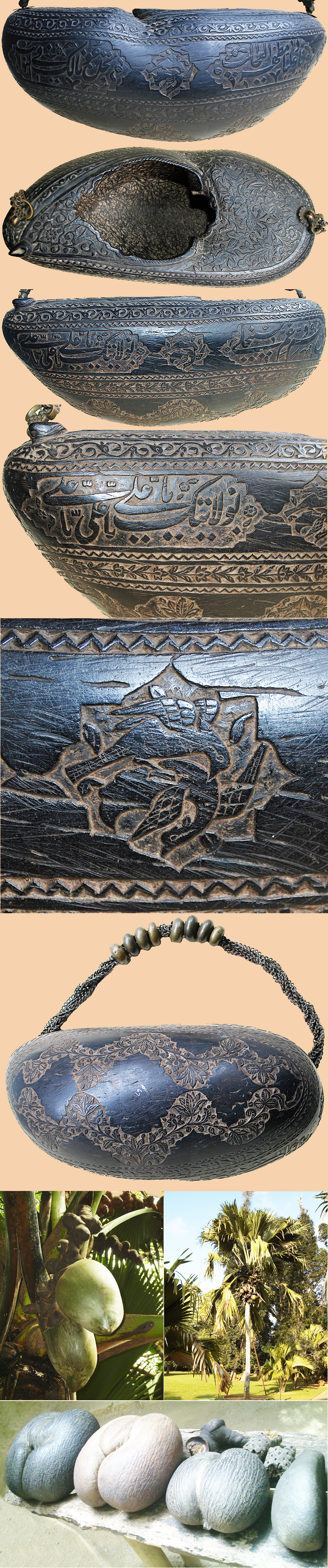 Kashkuls carried the donations on which dervishes relied for sustenance and also functioned as drinking vessels or food containers for wandering ascetics. They simultaneously symbolized the emptying of the Sufi’s soul or ego through the renunciation of worldly goods and aspirations, and the nourishment of that soul with divine knowledge. Many the coco-de-mr palm native to Seychelles Island of the Indian Ocean. The shells’ lengthy sea voyage to the shores of Iran carries special significance as a metaphor for the Sufi’s mystical journey. The top of this example shows a paradisiacal scene of birds in flowering, fruit laden trees.