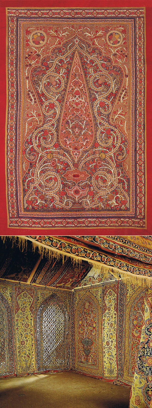 Qajar royal tent made for Muhammad Shah Circa (1834-1848) early 19th century wool embroidered Reshti Dozi woolen appliques, one of these tent is now in the V & A museum London