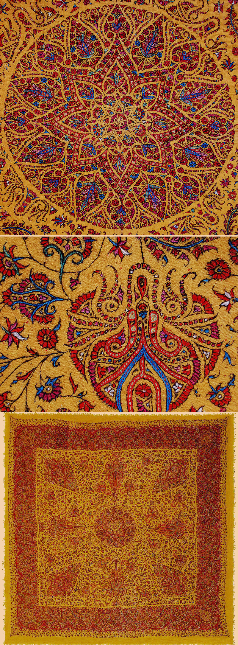 Antique Persian Shawl .Extremely fine Kerman Pateh-Duzi Embroidery wool on wool Shawl with Saffron color Mid 19th Century