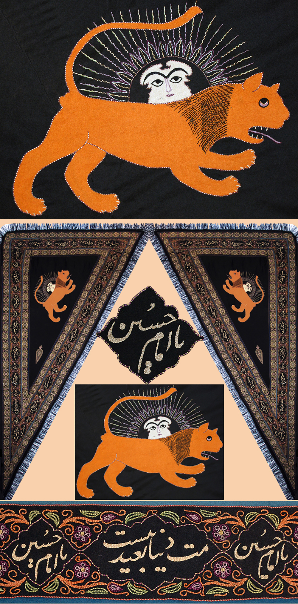 A Pair of Antique Persian Rashti-Duzi Flag, Silk Embroidery on Felt with Calligraphy in the Border