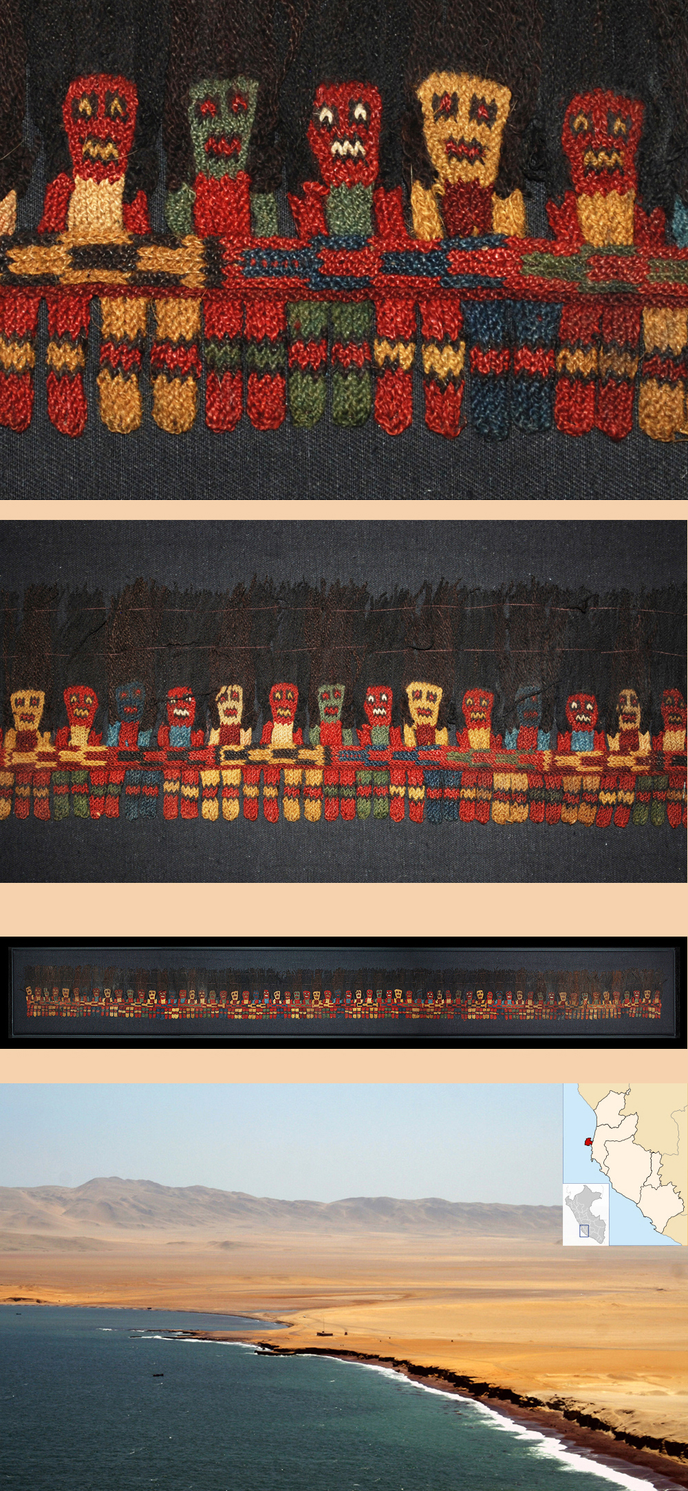 This extraordinarily complex mantle, or cloak, is one of the most renowned Andean textiles in the world. It was most likely used as a ceremonial object. The ninety figures decorating the border, created by needle knitting, have been interpreted as a microcosm of life on Peru’s South Coast two thousand years ago, with a particular focus on agriculture. Many figures may represent humans impersonating gods and acting as intermediaries between the real and supernatural worlds. Severed human trophy heads are shown as germinating seeds, suggesting the practice of ritual sacrifice and the interconnected cycles of birth and death