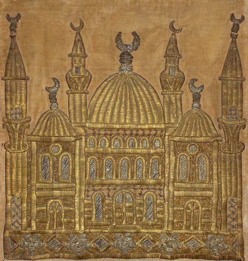 Antique Turkish Textile, Embroidery with gold thread on Velvet. Design of a Mosque. Ottoman Dynasty 1453-1922A.D Size 17" x 15" Size 43 x 38cm